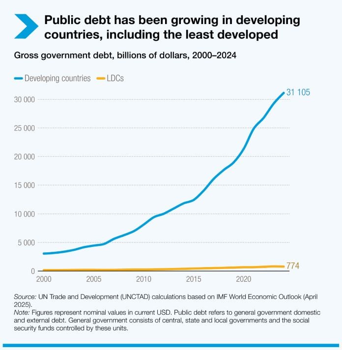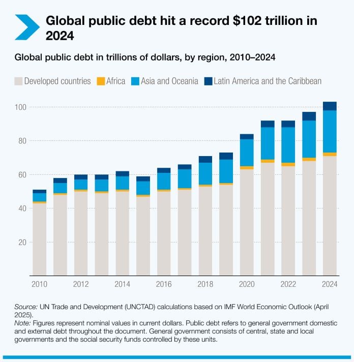 Alors que la dette publique mondiale culmine à 102 000 milliards de dollars en 2024, c’est le continent africain qui porte le fardeau le plus lourd relativement à ses capacités économiques. Si les pays en développement cumulent 31 000 milliards de dollars de dette, l’Afrique se distingue par une trajectoire particulièrement préoccupante : sa dette publique a été multipliée par deux entre 2010 et 2024, passant de 1 000 à 2 000 milliards de dollars selon les données présentées à la CNUCED16.